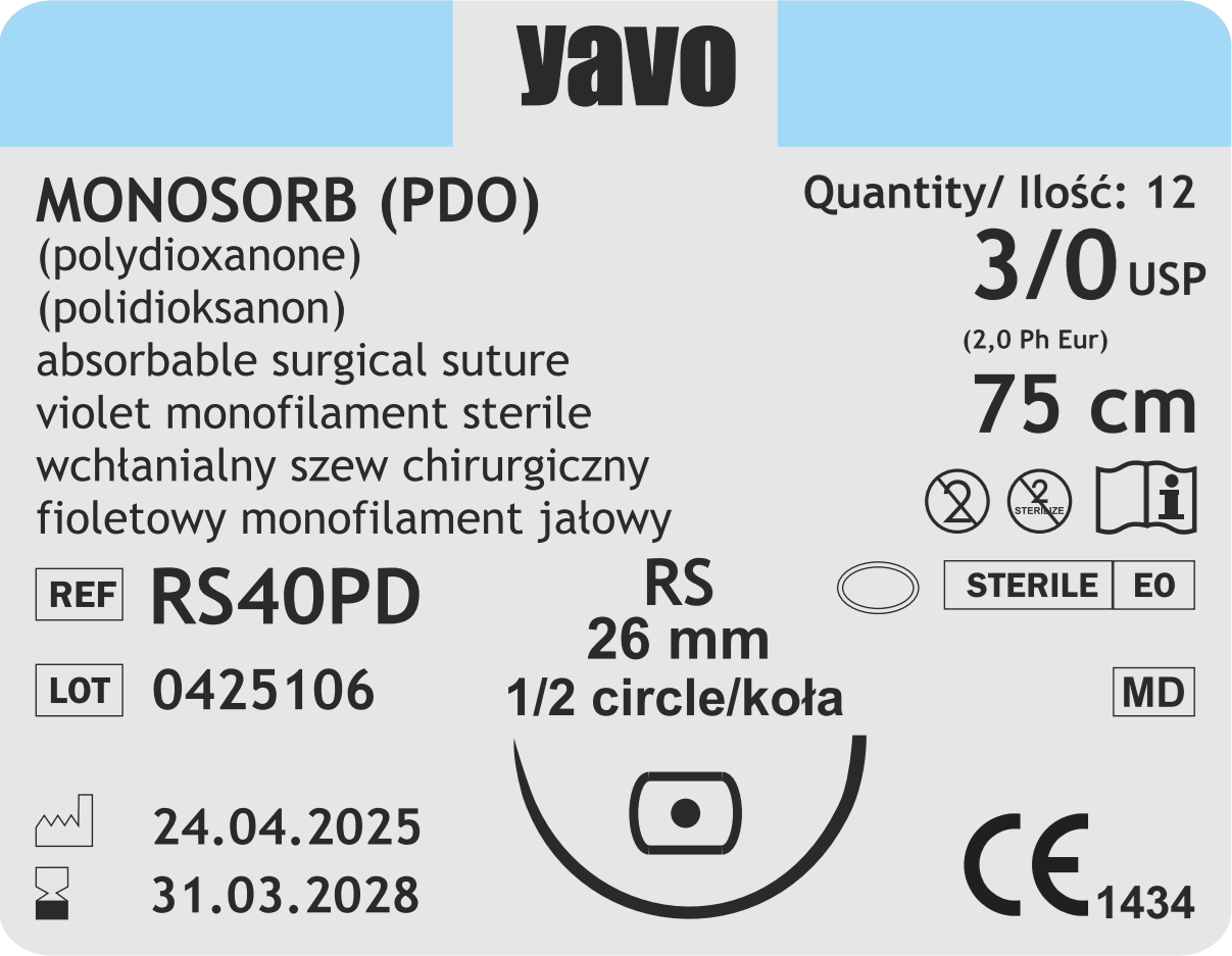 | Unterstützung des Gewebes / Absorbtion | Für Fadenstärke 4/0 bis 7/0: ca. 75 % nach 14 Tagen ca. 65 % nach 28 Tagen ca. 55 % nach 43 Tagen ca. 40 % nach 57 Tagen für Fadenstärke 3/0 bis 2: ca. 75 % nach 14 Tagen ca. 70 % nach 28 Tagen ca. 60 % nach 43 Tagen ca. 40 % nach 57 Tagen Vollständige Resorption durch Hydrolyse in ca. 180-210 Tagen |